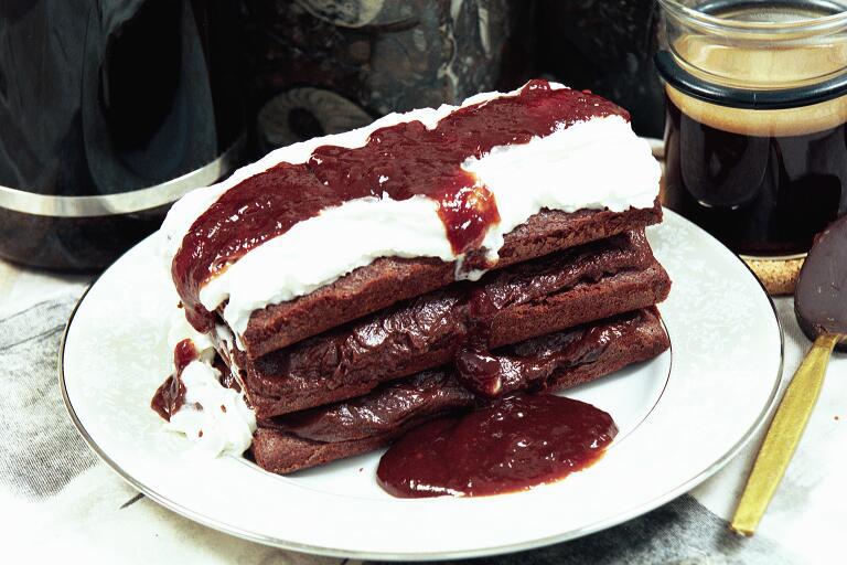 Grease and flour a 9 x 13 inch pan and preheat oven to 350 degrees. 2 In a small heavy sauce pan melt butter, chocolate and cocoa. 3 In a large mixing bowl stir together sugar, flour and eggs using a large wooden spoon. 4 Pour chocolate mixture into eggs mixture, add vanilla and mix thoroughly . Then pour batter into pan and bake for 20 minutes. Remove from oven and let cool. Once cooled cut into 2 x 4 inch pieces and set aside. 5 To make filling melt chocolate, cocoa and 1 tablespoon of butter in a double boiler and set aside. 6 In a large mixing bowl of an electric mixer combine butter and sugar. Then blend in chocolate mixture. Once thoroughly mixed, beat in egg at high speed for 1 to 2 minutes 7 For the raspberry toping place jam and berries into a small sauce pan and heat while stirring until berries are combined with jam and mixture is warmed. Do not boil. Remove from heat, add chips and stir until chips are melted into sauce. 8 You are mow ready to make your stacks. Place one of the cake pieces on a desert plate. Cover the top with filling then place another piece on top. Cover the second piece with filling and cover with another piece. Top with whipped cream and spoon on chocolate raspberry sauce. |